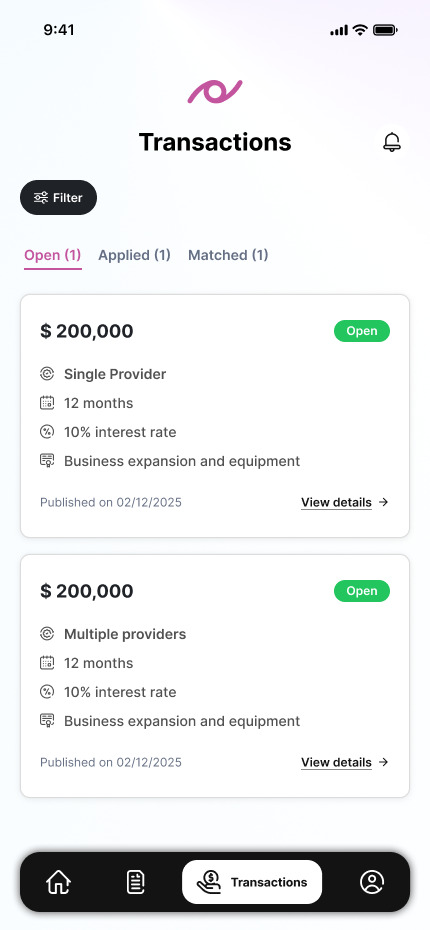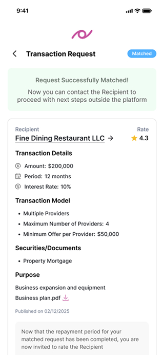Recipients pay matching fees and interest on the agreed amount. Providers earn interest on committed amount in return. Users rate each other following each matched transaction to enhance transparency and support future informed decision-making.